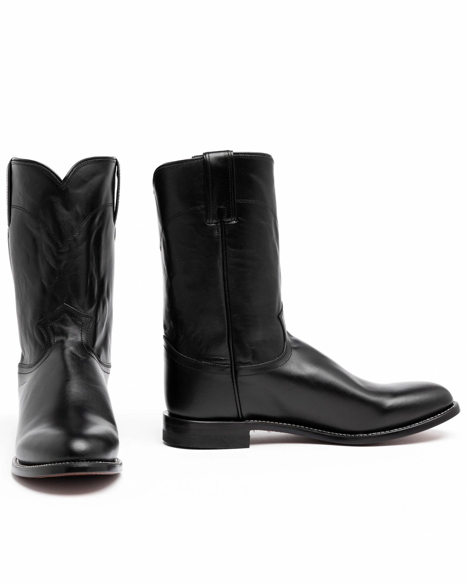 These boots have classic Justin style with innovative Justin technology! The vamp and 10″ shaft are made from genuine leather and they feature the patented J-Flex Flexible Comfort System. This system includes a leather-covered cushioned insole and triple density insole board that work together to generate return energy as you wear them. The J-Flex Comfort System make it feel like these boots were made specially for your feet. The round roper toe provides room for your toes while the low heel keeps you comfortable for long periods of time spent standing up. Complete with a leather outsole, these boots will look great with your slacks or your most comfortable pair of jeans.