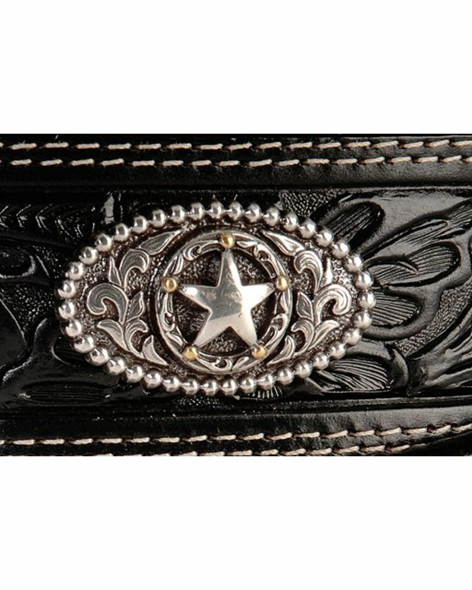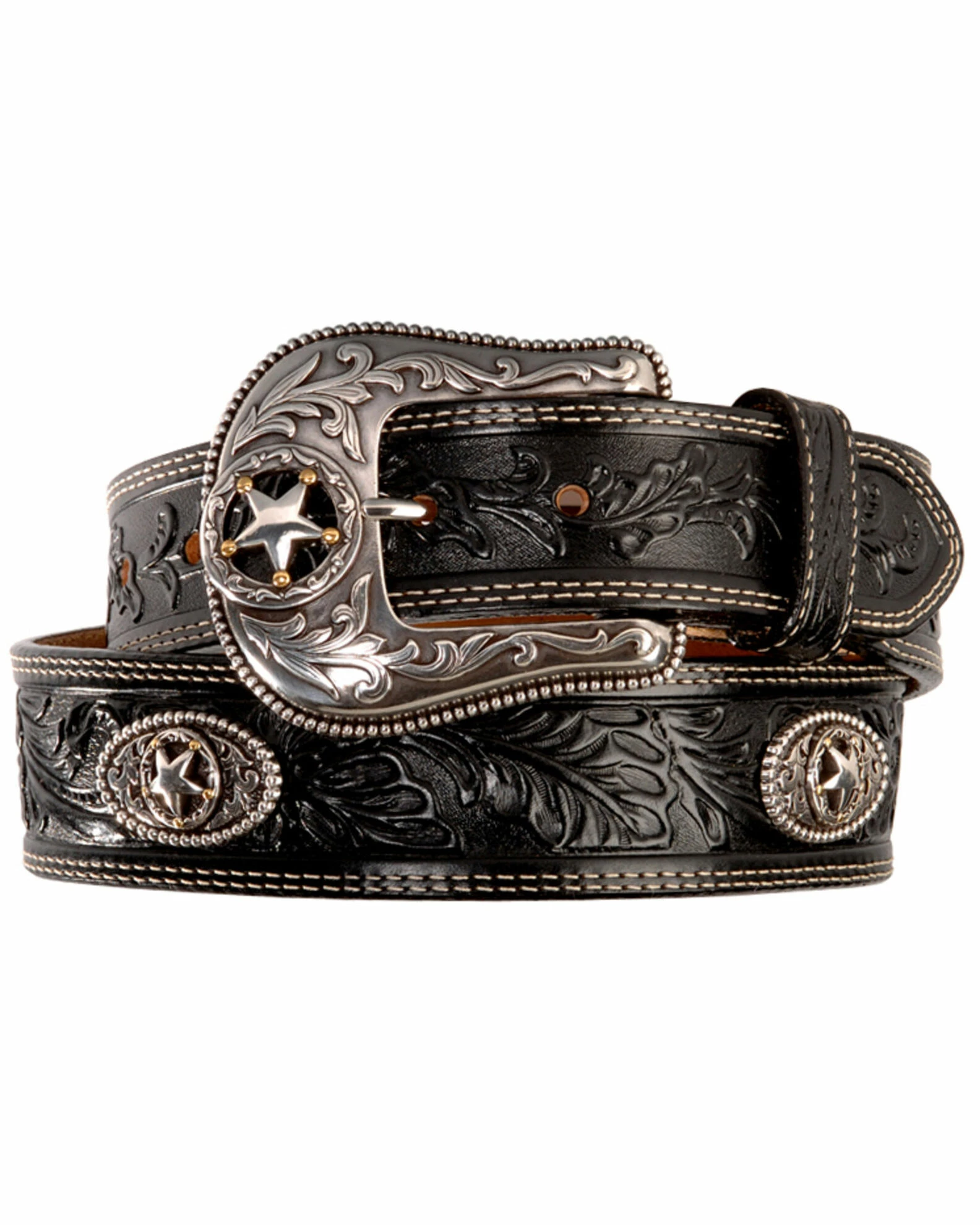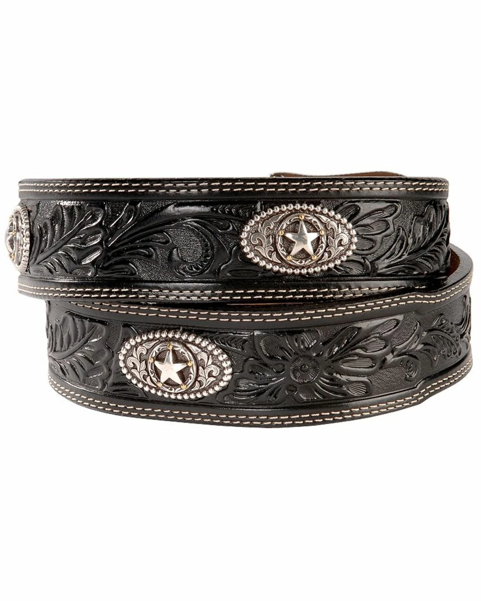 Justin Black Silver Stars Embossed Belt will be a hit at the rodeo and the dance floor. This classic western belt is made of top grain leather and features a stunning embossed filigree design. It is studded throughout with silver conchos that feature stars and vines. The removable silver tone buckle set features the same star design. Wear this belt with your denim and boots for a traditional western look.