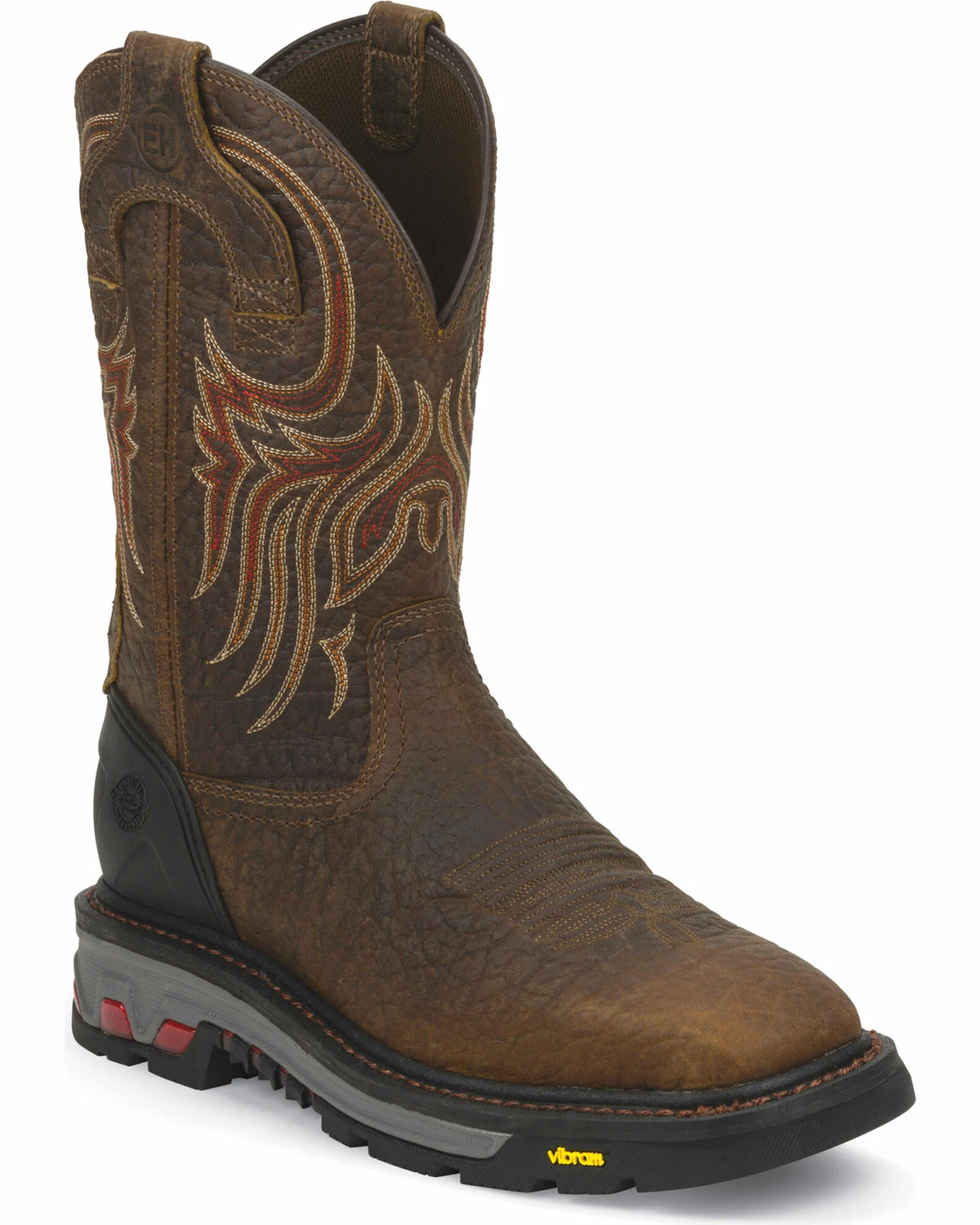 These boots are built tough from full-grain leather for tough working men. These rugged work boots have a soft square toe design with an 11″ shaft, Ortholite insole, and a nylon shank. Work your hardest and look your best with Justin Original Workboots.