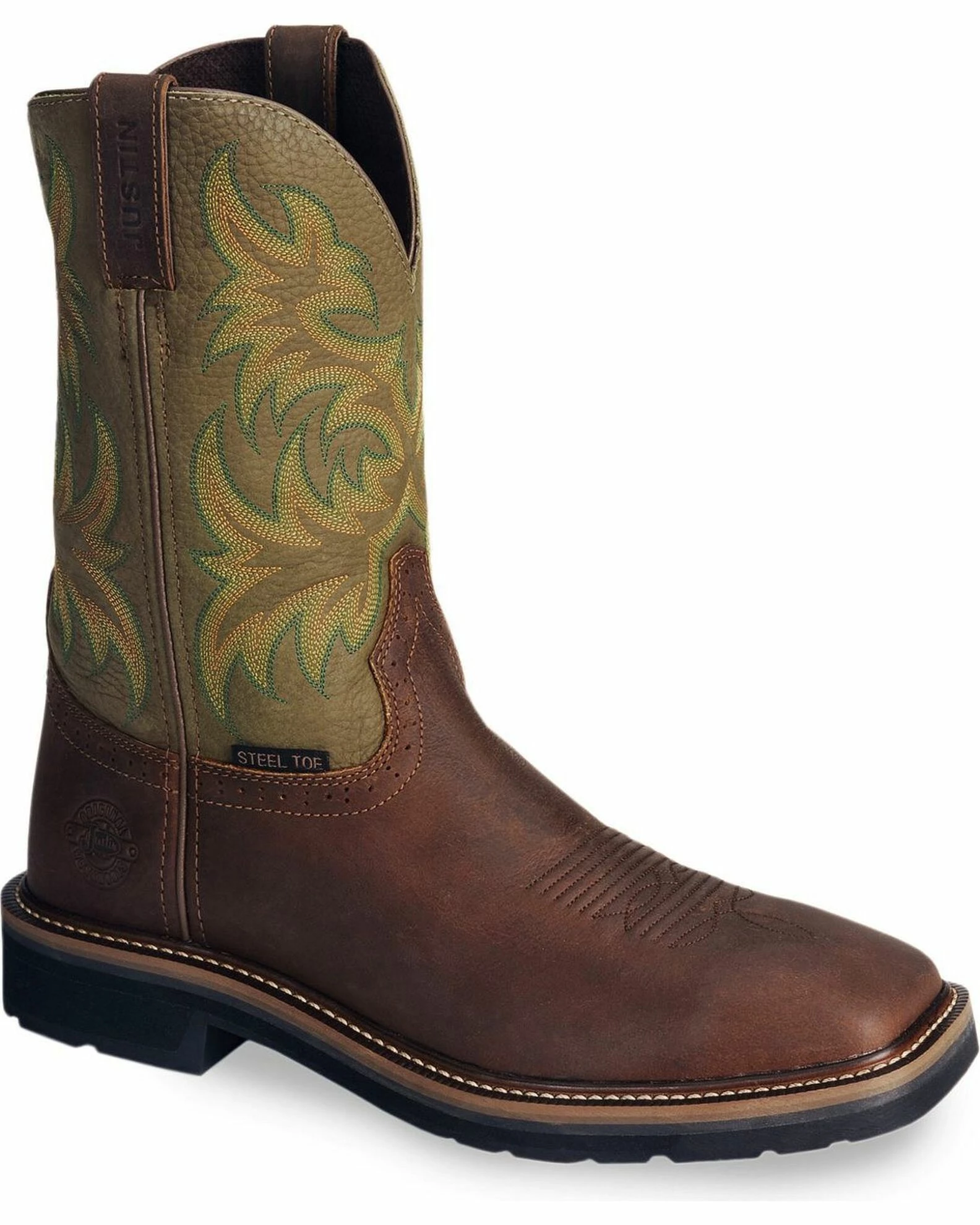 Outfit yourself in Justin Boots for durable, comfortable, and dependable work gear. These Western Work boots are made with a moldable full-grain leather and a comfy square toe. The steel toe feature keeps feet protected from falling and rolling objects. Comfort is given through the J-Flex flexible comfort system which generates return energy for all day wear. Wear these through the work day and keep them on for night, with the stylish design, these boots were made for any occasion.