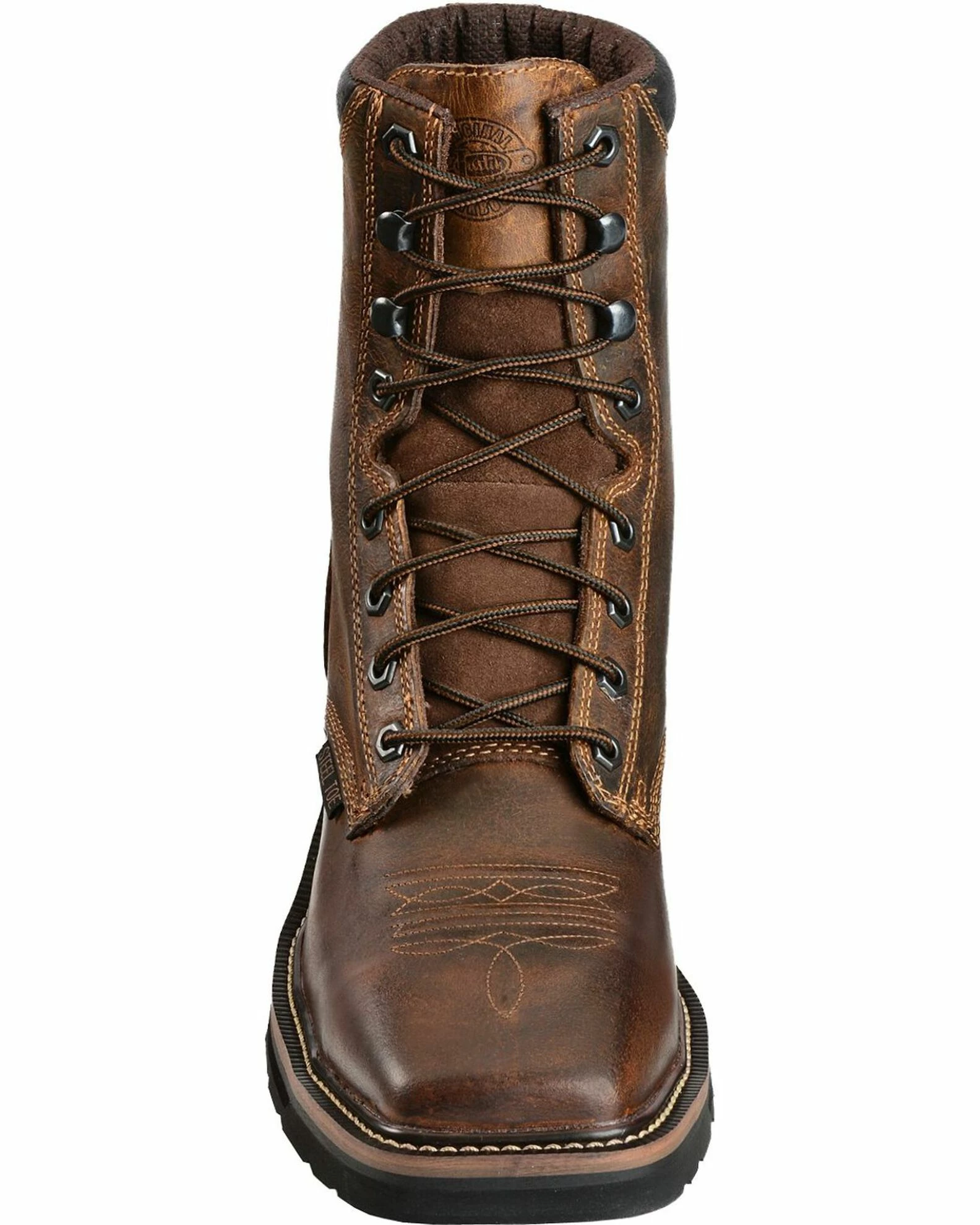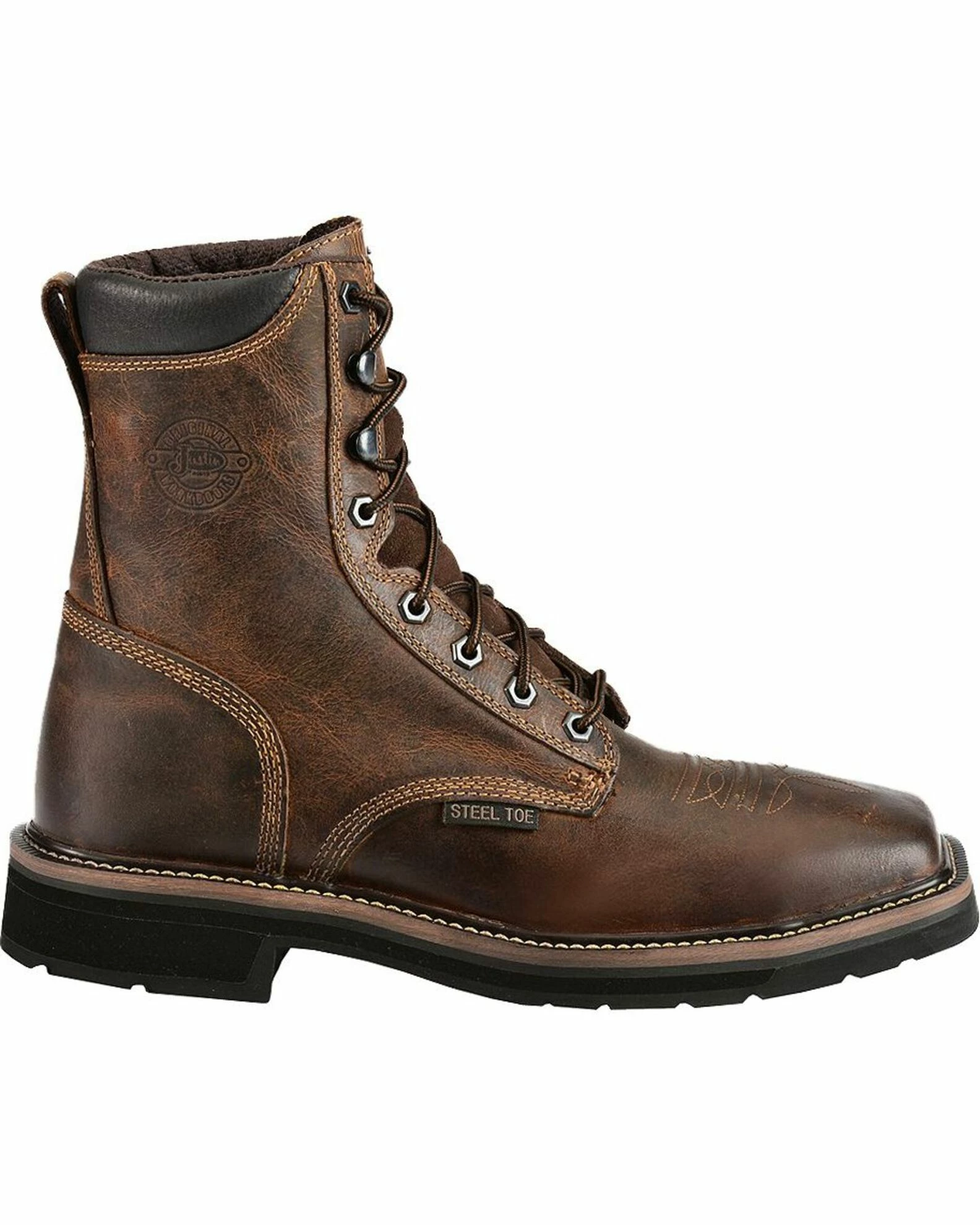 This pair of Justin Stampede work boots features a genuine leather foot and matching 8″ shaft with leather lining. Modern square steel toe profile. Single stitched welt. 1 1/2″ block heel.