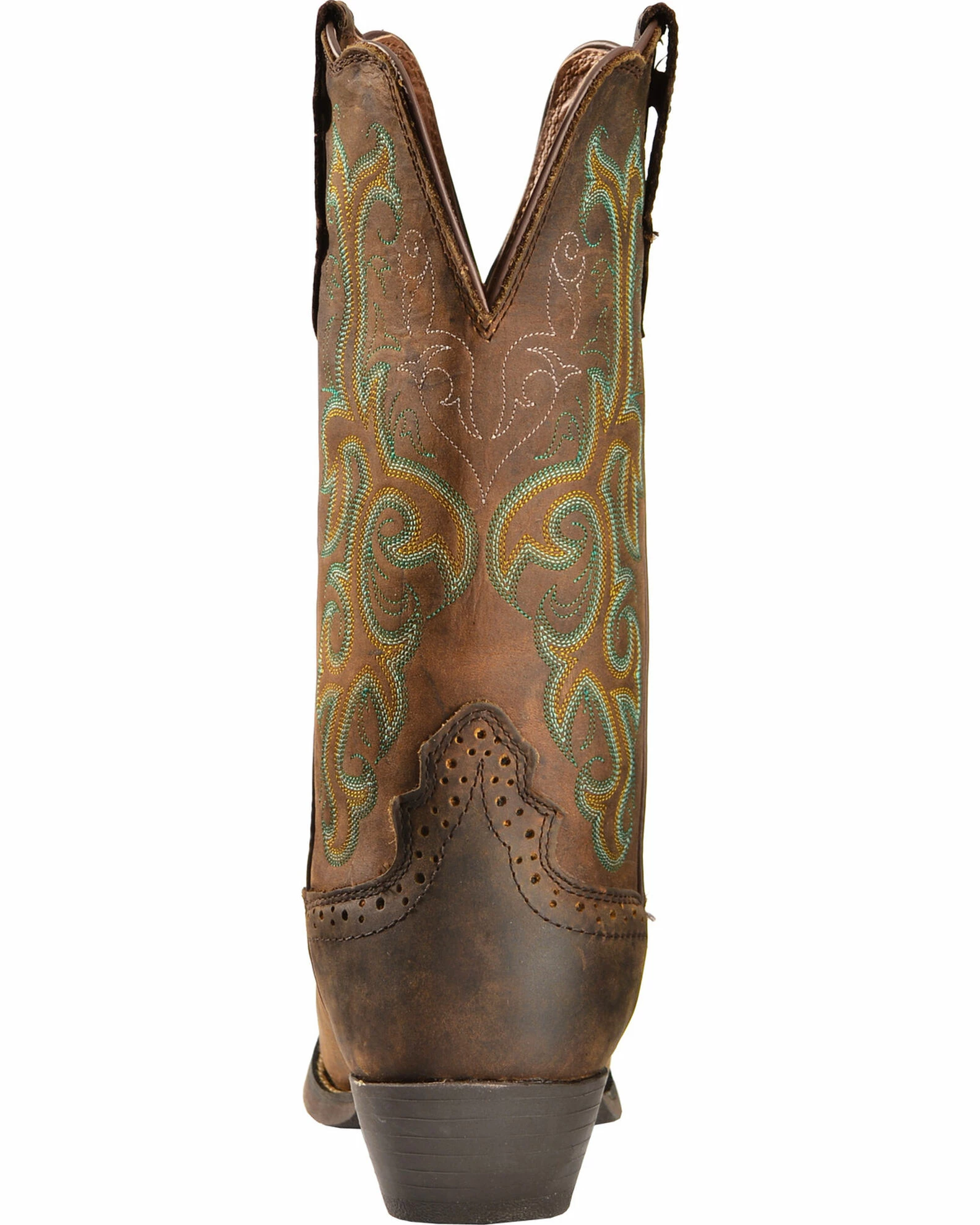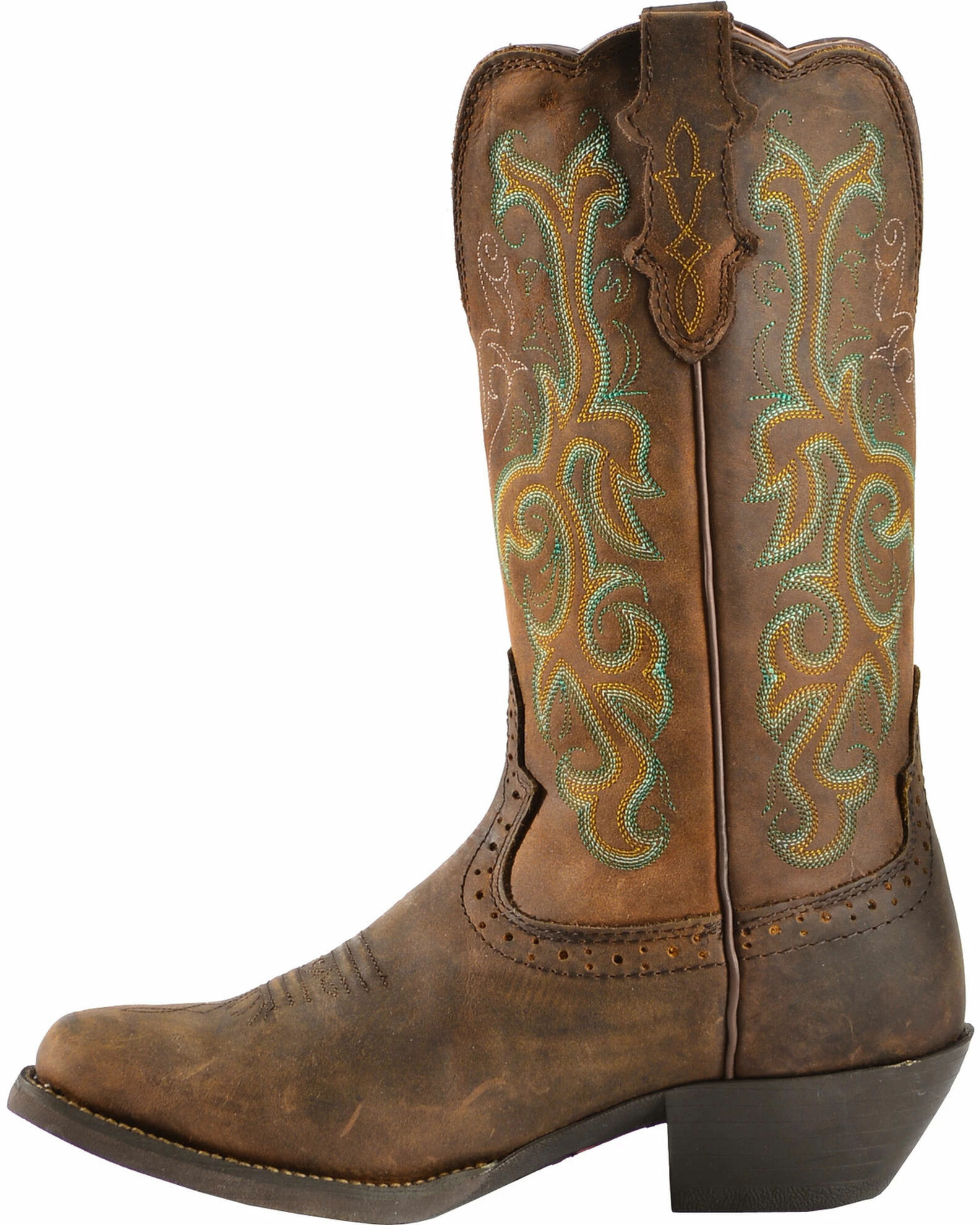 Part of the Stampede Western series, these cowgirl boots by Justin are perfect for hanging out around the ranch, going out around town, or even working around the farm. It has intricate multi-colored threads lacing through the shaft to create a beautiful multi-toned western scrolling. It also has a wide square toe to afford wiggle room, and a scallop collar as a quiet yet stunning feature. For comfort and stability, these boots have the J-Flex flexible comfort system with a removable orthotic insert as well as the Justin Stabilization technology.