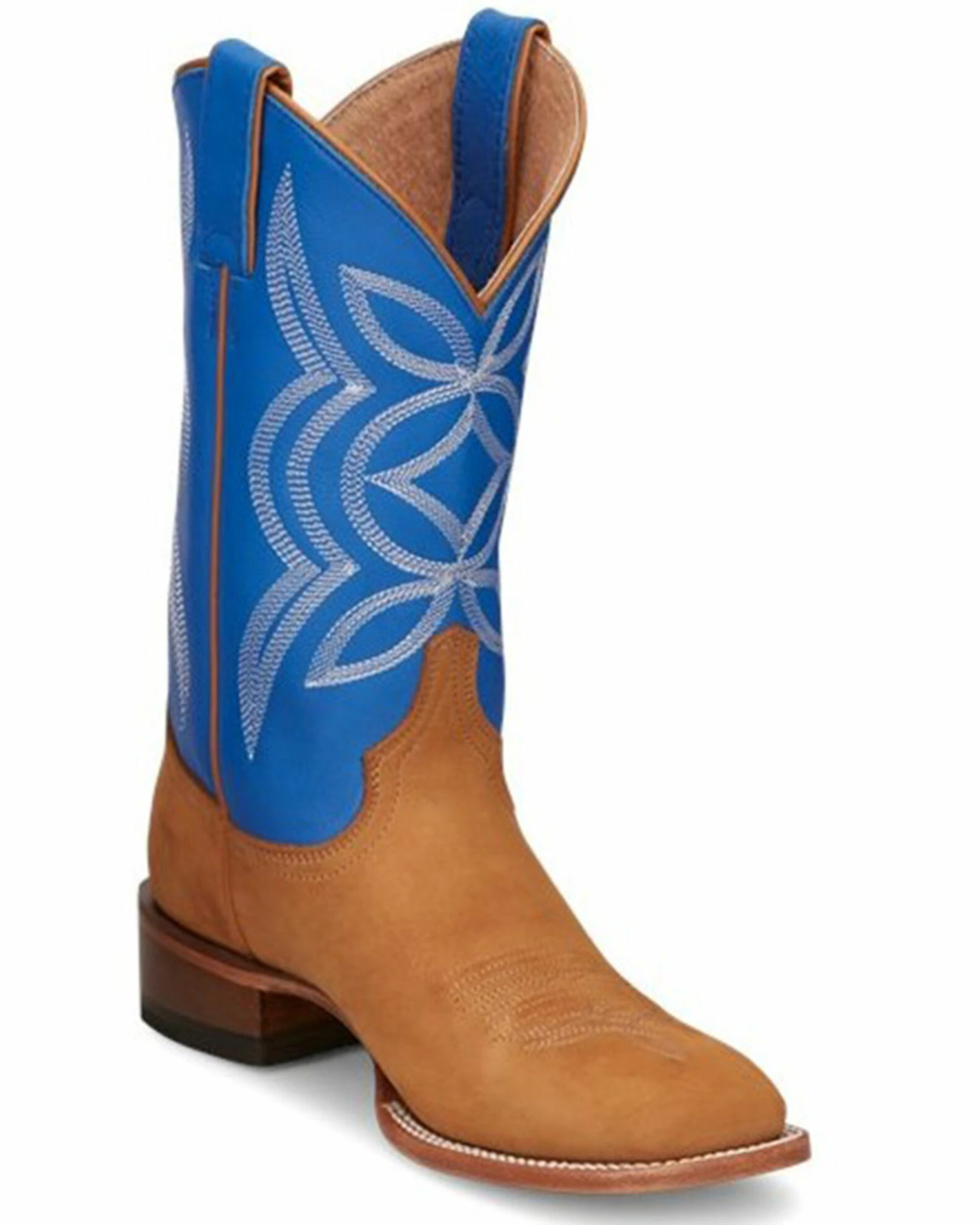 Justin Women’s Hayes Jewel Blue & Tan Cowhide Leather Western Boots – Wide Square Toe